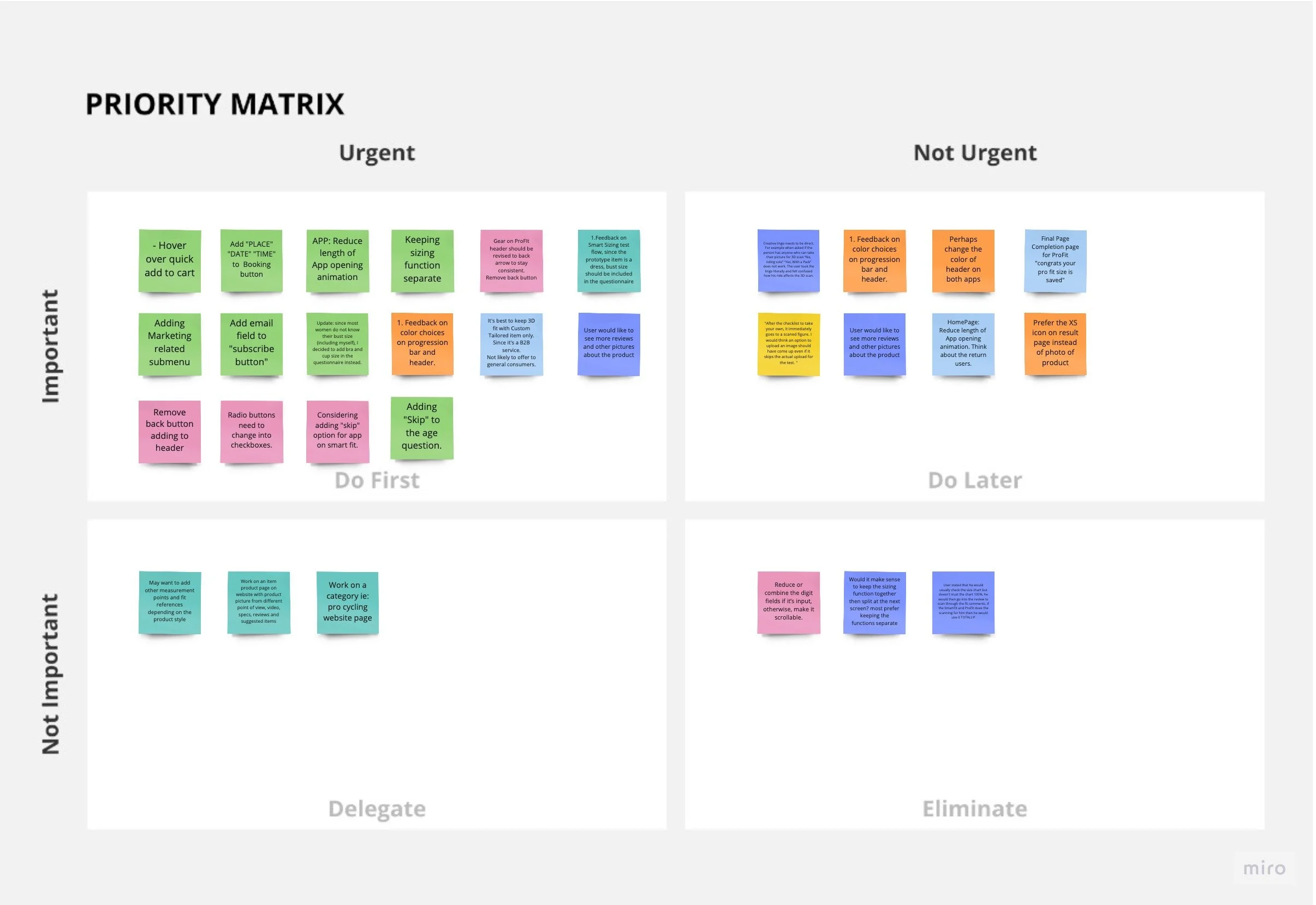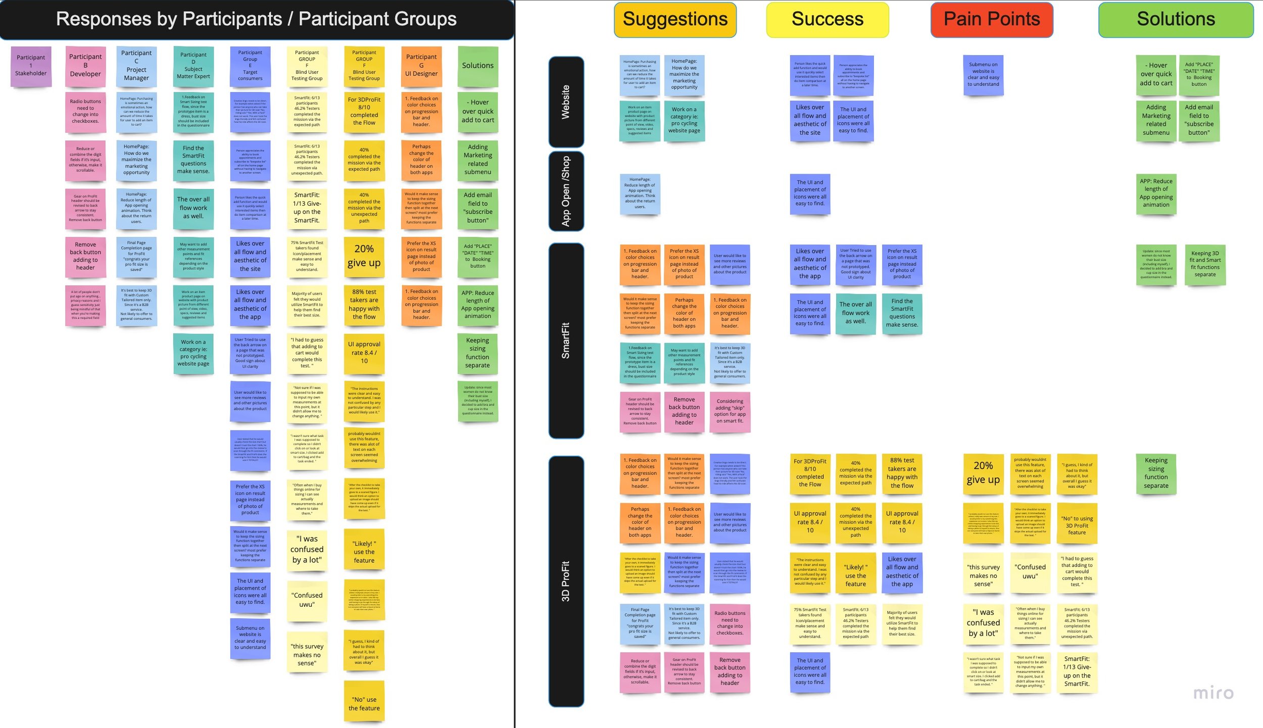 Sorting out the findings in four categories- Homepage, App, SmartFit and ProFit under 4 areas of Suggestions, Successes, Pain and Solutions.